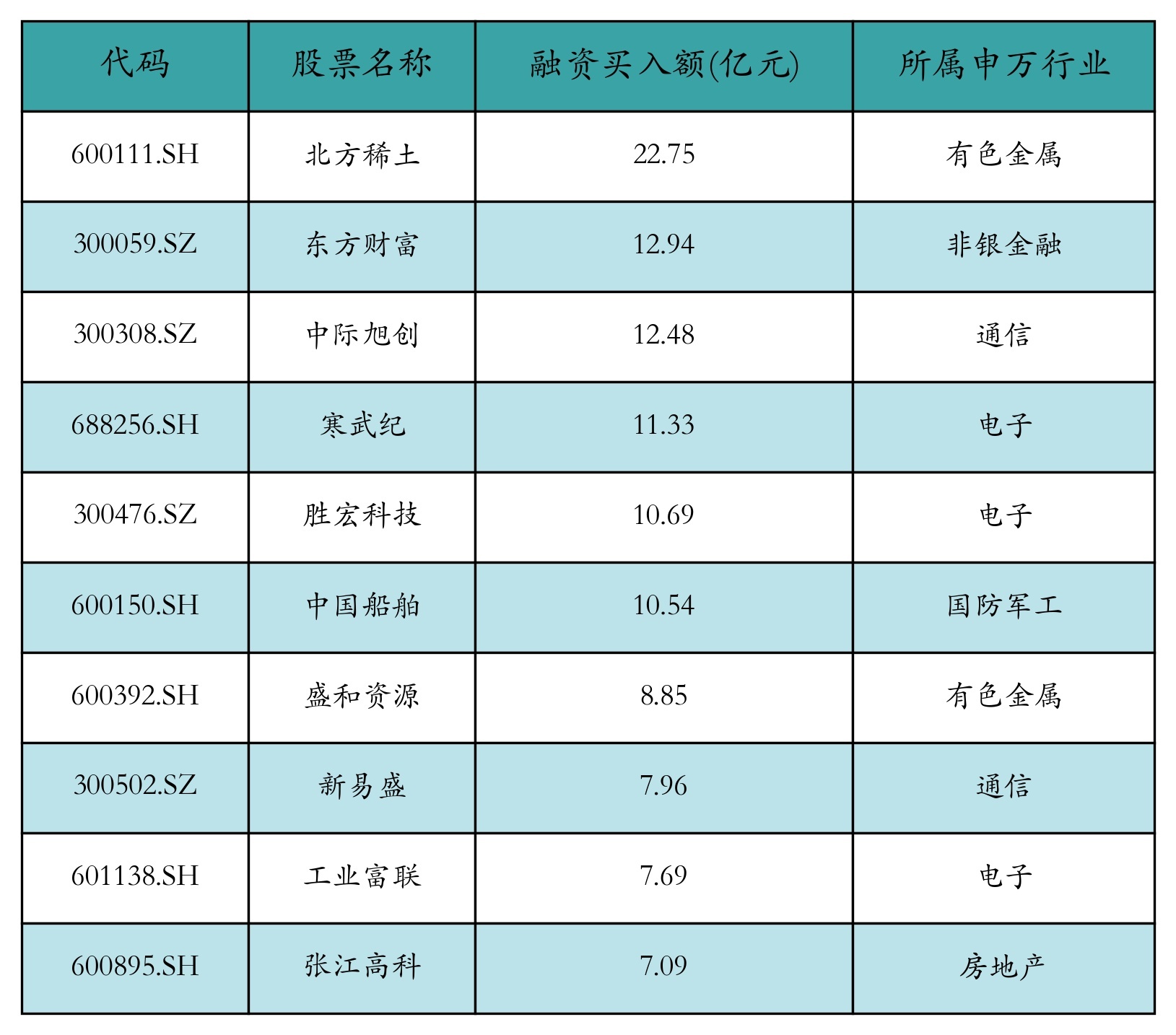 两市共有3440只个股有融资资金买入,其中北方稀土、东方财富、中际旭创排名前三,买入金额分别22.75亿元、12.94亿元、12.48亿元。融资买入额前10个股详情见下表: