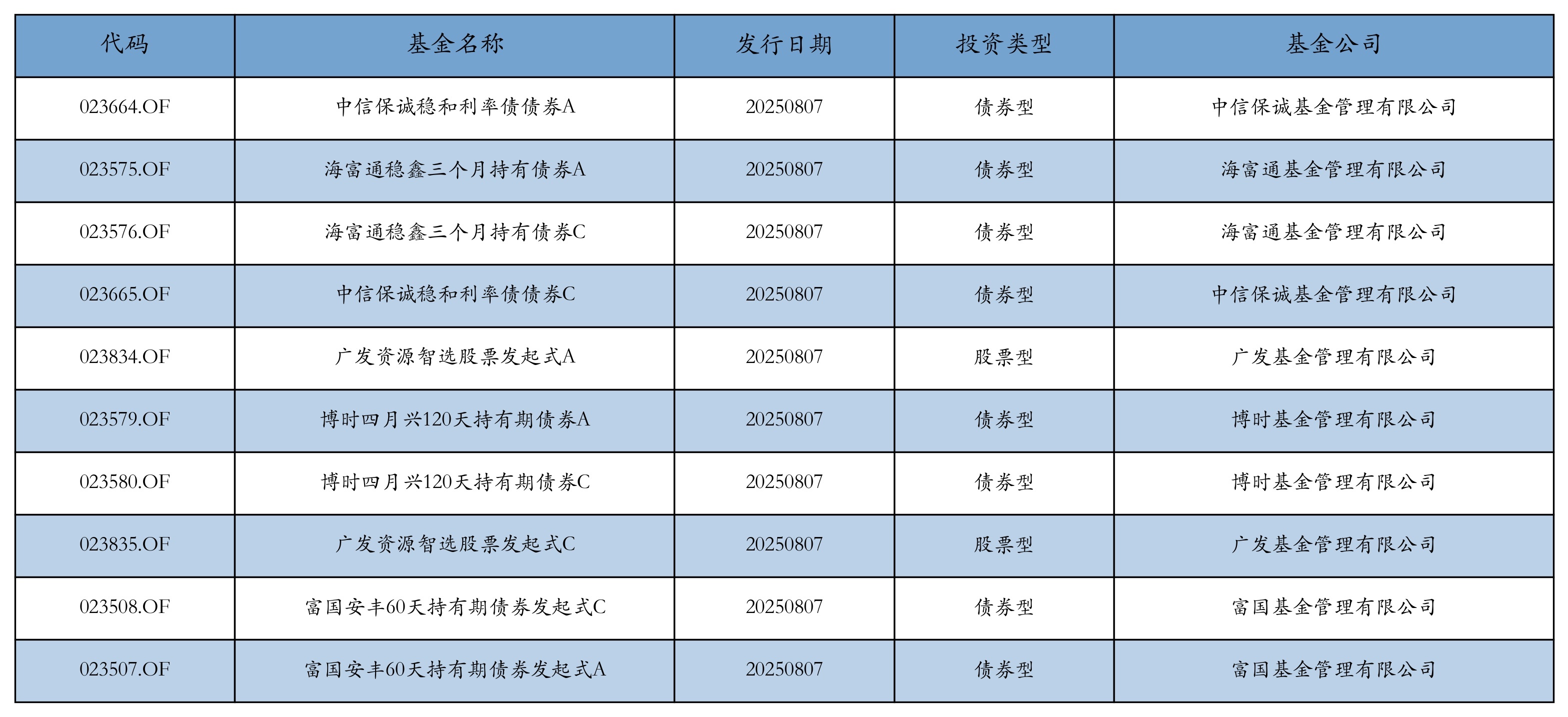 昨日有10只新基金发行,分别为:中信保诚稳和利率债债券A、海富通稳鑫三个月持有债券A、海富通稳鑫三个月持有债券C、中信保诚稳和利率债债券C、广发资源智选股票发起式A、博时四月兴120天持有期债券A、博时四月兴120天持有期债券C、广发资源智选股票发起式C、富国安丰60天持有期债券发起式C、富国安丰60天持有期债券发起式A,详情见下表: